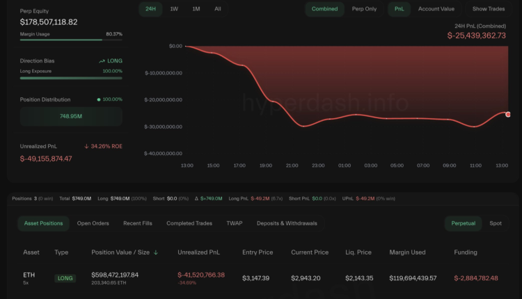 The largest is an ETH long position worth $598 million, opened at $3,147, which faces liquidation if Ether’s price falls below $2,143, according to blockchain data platform Lookonchain’s Tuesday X post.