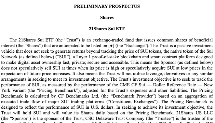 Called the 21Shares Sui ETF, the proposed ETF will issue common shares of beneficial interest by seeking to track the performance of SUI held by 21Shares’ US subsidiary.