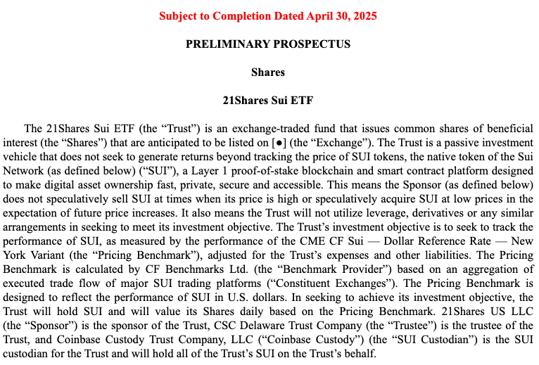 The filing highlighted that the ETF aims to provide exposure to SUI by holding the tokens directly, without utilizing leverage, derivatives or engaging in speculative trading.