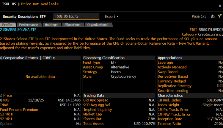 The fund holds spot SOL and will stake its holdings to secure the blockchain network and reap rewards, according to an announcement from 21shares. Senior Bloomberg ETF analyst Eric Balchunas said: