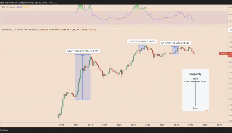 In December 2016, Ethereum formed a similar monthly Dragonfly doji before erupting from under $6 to over $1,400 in over a year. The same pattern has been seen, with smaller upside, in 2021 and 2023, where ETH gained over 80% and 145%, respectively.