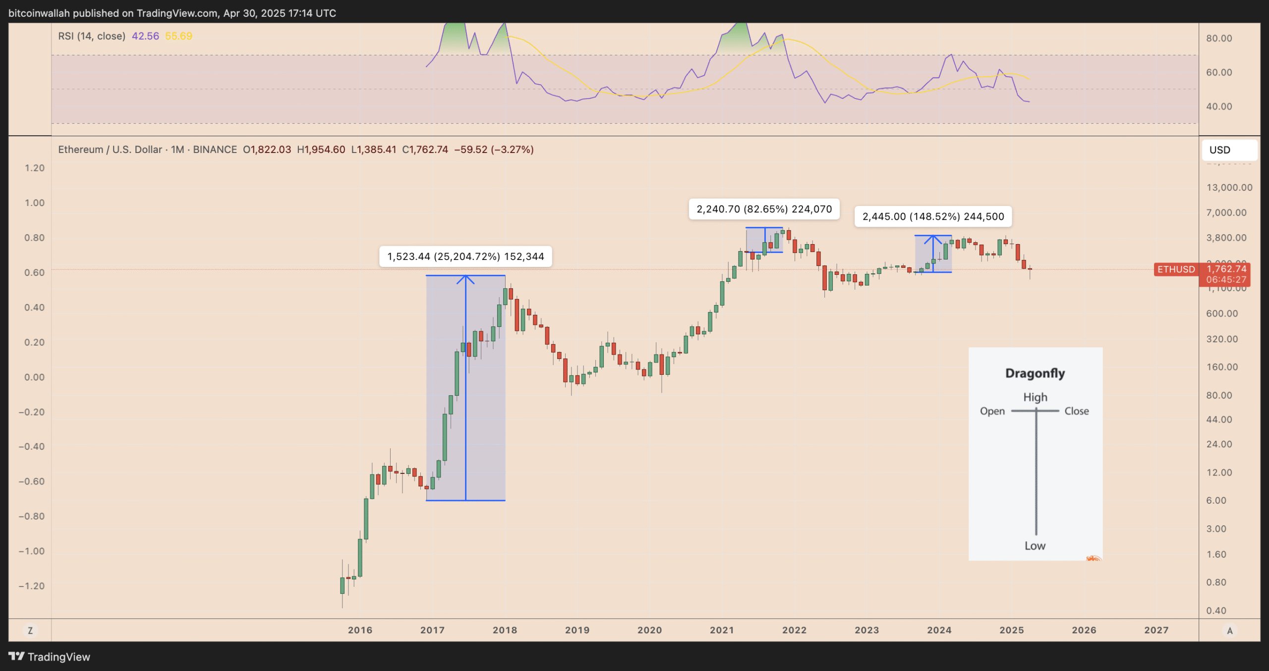 In December 2016, Ethereum formed a similar monthly Dragonfly doji before erupting from under $6 to over $1,400 in over a year. The same pattern has been seen, with smaller upside, in 2021 and 2023, where ETH gained over 80% and 145%, respectively.