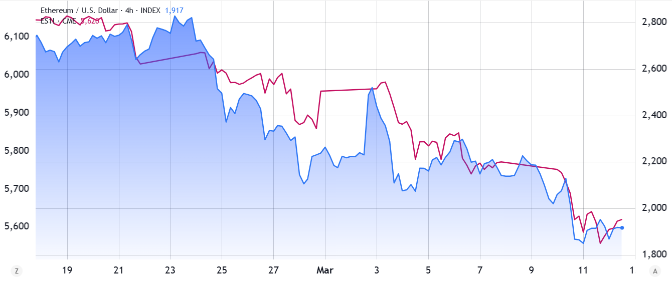 S&P 500 futures (left, magenta) vs. Ether/USD (blue). Source: TradingView/Cointelegraph
