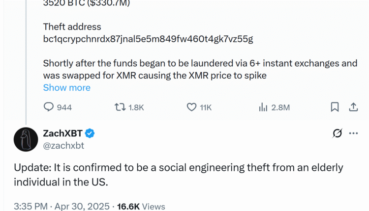 The hack took place on April 28, 2025, when ZachXBT flagged a suspicious transfer involving 3,520 Bitcoin (BTC), valued at $330.7 million.