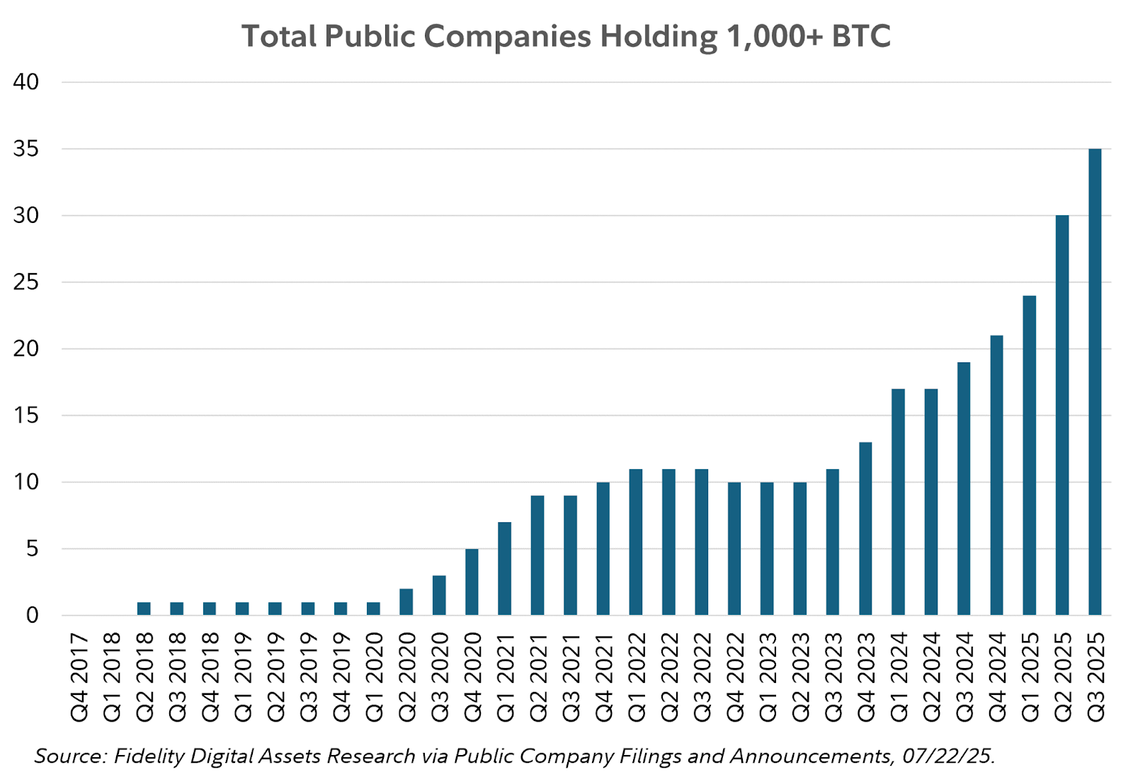According to Chris Kuiper, vice president of research at Fidelity Digital Assets, at least 35 public companies have now surpassed 1,000 BTC in holdings on their balance sheets, worth more than $116 billion at the time of writing, up from 24 companies at the end of Q1.