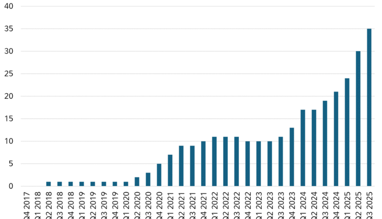 “Not only did the total purchases increase from Q1 to Q2 of 2025 […], but there are a lot more companies doing the buying,” said Fidelity’s Kuiper.