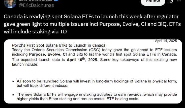 The Ontario Securities Commission (OSC), a provincial regulator, green-lighted 3iQ’s SOL fund on April 14. The approval was also extended to other fund managers seeking to offer SOL ETFs, including Purpose, Evolve and CI.