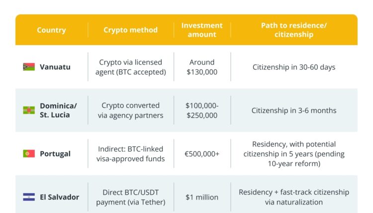 All structures are visa-approved, though they operate through fiat conversions via licensed intermediaries — ideal for those asking how to get a golden visa with Bitcoin or gain access to crypto-friendly governments.
