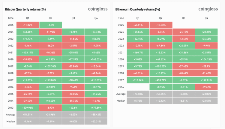 Bitcoin (BTC) and Ether (ETH), the two largest cryptocurrencies by market capitalization, saw price declines of 11.82% and 45.41%, respectively, over Q1 2025 — a quarter that has historically seen strong results for both assets. Since 2013, Q1 has been Bitcoin’s second-strongest quarter on average (51.2%) and historically the best for Ether (77.4%), according to CoinGlass data.