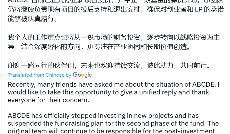 In an April 19 X post, ABCDE co-founder and Huobi exchange founder Du Jun said the $400 million fund will no longer invest in new projects or raise capital for the second phase of the fund.