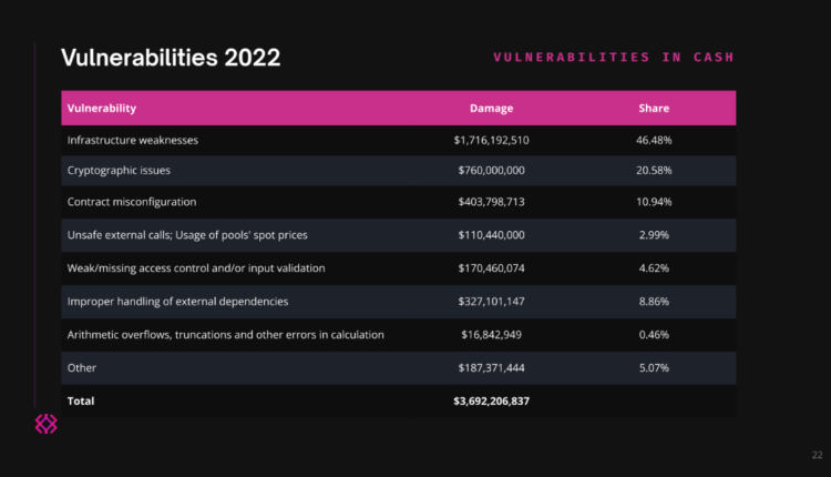 While these infrastructure vulnerabilities caused the greatest amount of losses compared to other categories, the second-largest cause of losses was “cryptographic issues” such as Merkle tree errors, signature replayability, and predictable random number generation. Cryptographic issues resulted in 20.58% of the total value of losses in 2022.