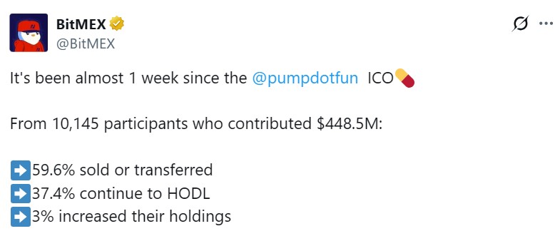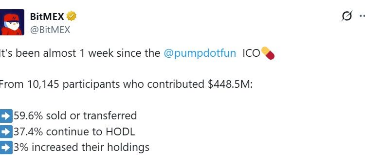 Almost 60% of presale participants in Pump.fun’s initial coin offering (ICO) have already sold or transferred their tokens to centralized exchanges (CEXs) or other wallets, according to data shared by BitMEX.