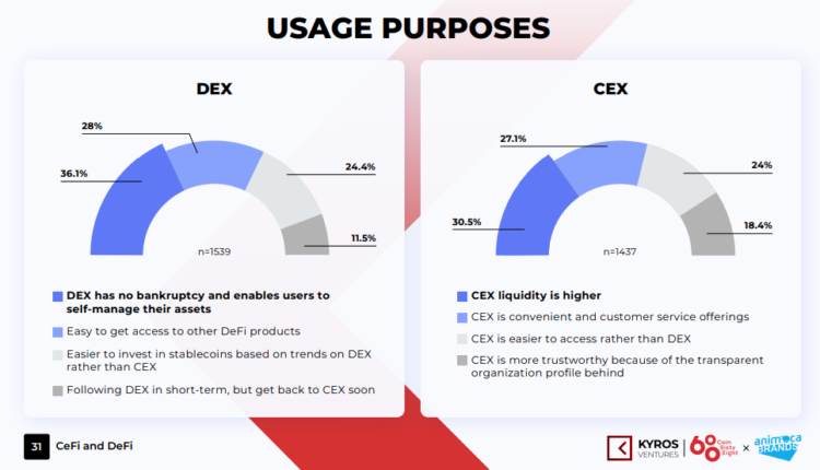 Nearly 90% of survey respondents engaged in DeFi activities, compared with 70.2% for GameFi, 73.7% for nonfungible tokens, 91% for centralized finance and 54.9% for SocialFi. Participants remain equally distributed between their preference for centralized exchanges compared to decentralized exchanges. Researchers summarized: