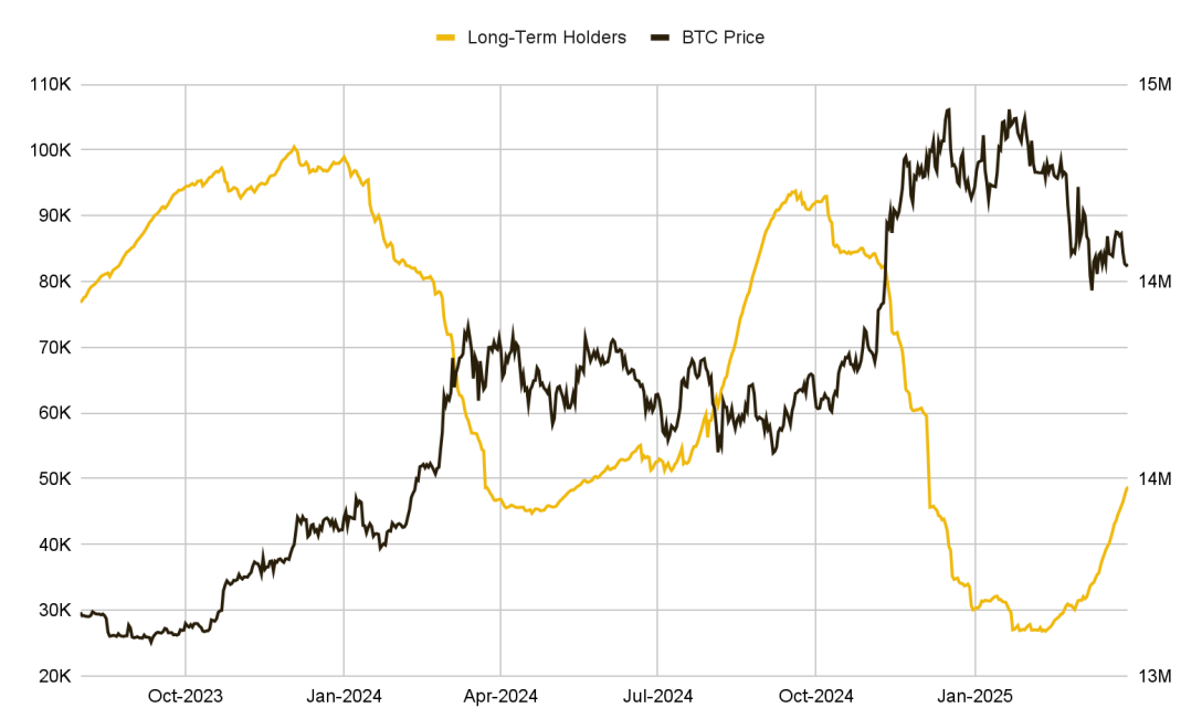 Long-term Bitcoin holders have restarted their BTC accumulation after the BTC supply held by long-term holders bottomed in February.