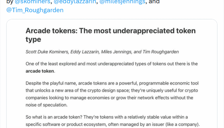 “Just as stablecoins unlock new forms of commerce, and network tokens enable decentralized value-sharing and governance, arcade tokens can power digital economies at scale,” said a16z researcher Scott Duke Komimers, chief technology officer Eddy Lazzarin and others.