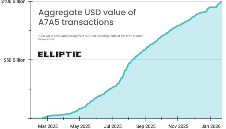 Elliptic said the $100 billion figure represents the cumulative value of all A7A5 transfers recorded on public blockchains, including Ethereum and Tron.