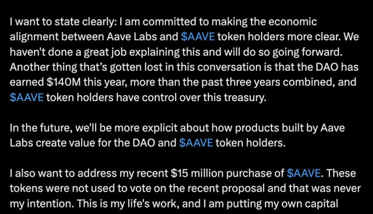 He also said that Aave Labs has not clearly communicated the economic alignment between it and Aave token holders. “In the future, we’ll be more explicit about how products built by Aave Labs create value for the DAO and AAVE token holders,” he added.