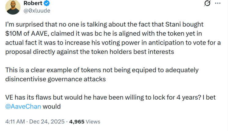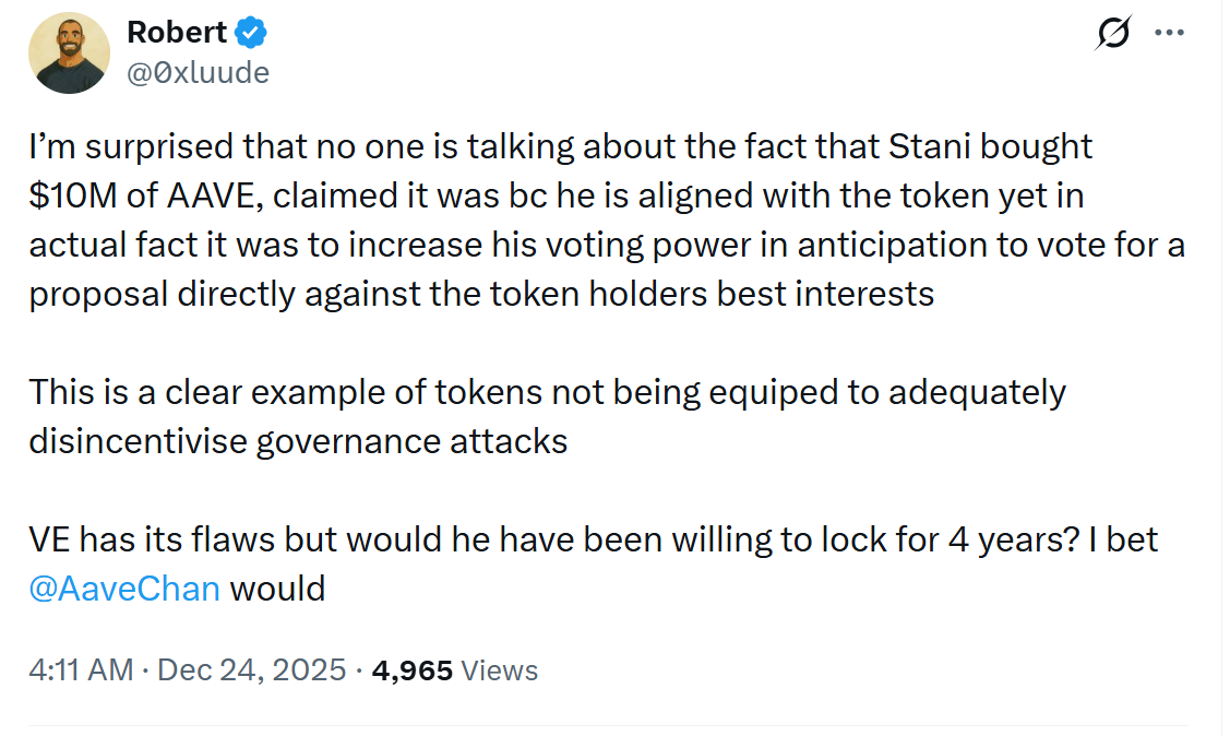 Samuel McCulloch of USD.ai pointed out the concentration of voting power. In an X post, he described the Aave vote as “silly,” adding that a small group of large holders accounted for about half of the total voting weight.