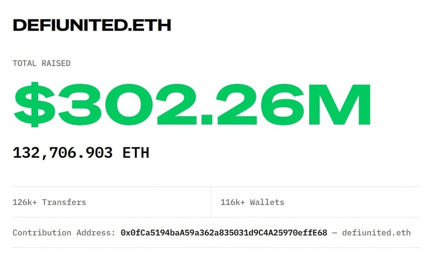 As of Tuesday, the DeFi United website showed $302.26 million in total raised or committed toward the recovery effort, equal to 132,706.903 ETH, though some commitments remain subject to DAO votes and final execution.