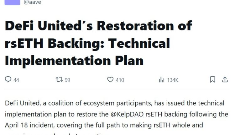 The Aave-linked recovery group DeFi United has published a technical implementation plan to restore rsETH backing after the April 18 Kelp bridge exploit released 116,500 rsETH, worth about $293 million at the time, without a corresponding burn on Unichain.