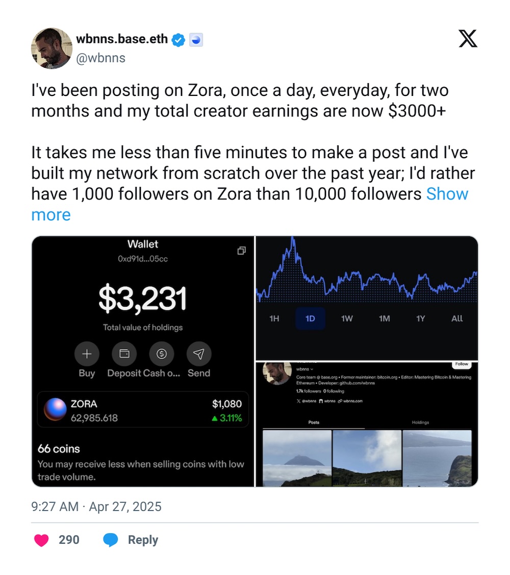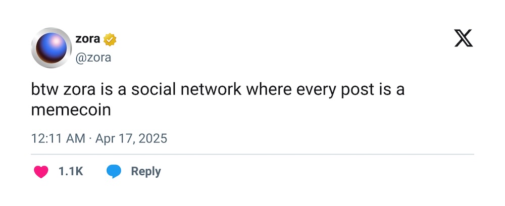 While posts on Zora used to be minted as NFTs, now each post creates an instantly tradeable memecoin, also known as a “content coin.” Creators are given 1% of the supply and earn 50% of the trading and liquidity provider fees.