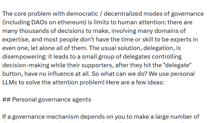 “If a governance mechanism depends on you to make a large number of decisions, a personal agent can perform all the necessary votes for you, based on preferences that it infers from your personal writing, conversation history, direct statements,” he said.