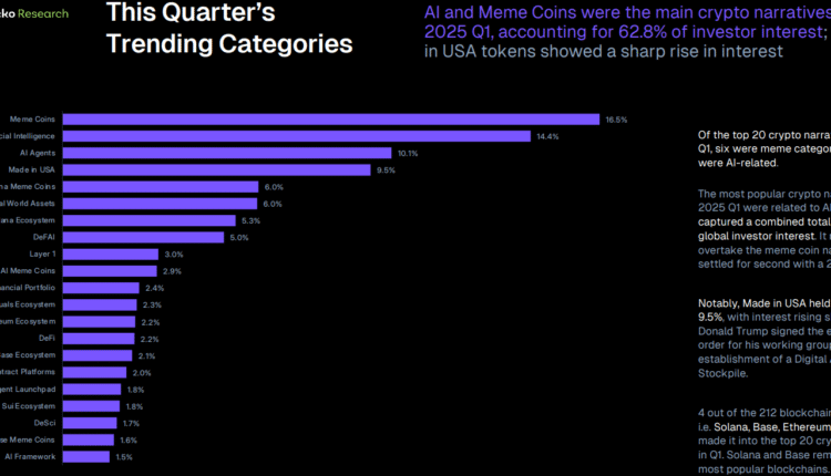 Artificial intelligence tokens and memecoins were the dominant crypto narrative in the first quarter of 2025, accounting for 62.8% of investor interest, according to a quarterly research report by CoinGecko. AI tokens captured 35.7% of global investor interest, overtaking the 27.1% share of memecoins, which remained in second place.