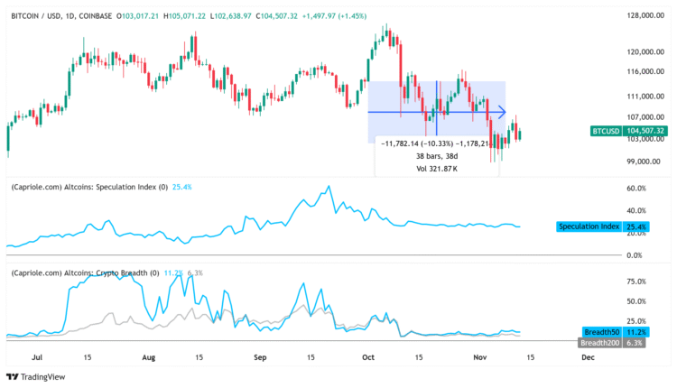 Meanwhile, Capriole Investments’ CryptoBreadth50 and CryptoBreadth200 stand at 11.2% and 6.3%, respectively, showing that only a small share of major cryptocurrencies are currently trending above key 50-day and 200-day moving averages. Such narrow participation often reflects lingering risk aversion but can also precede broader recoveries if BTC begins to pull the market higher.