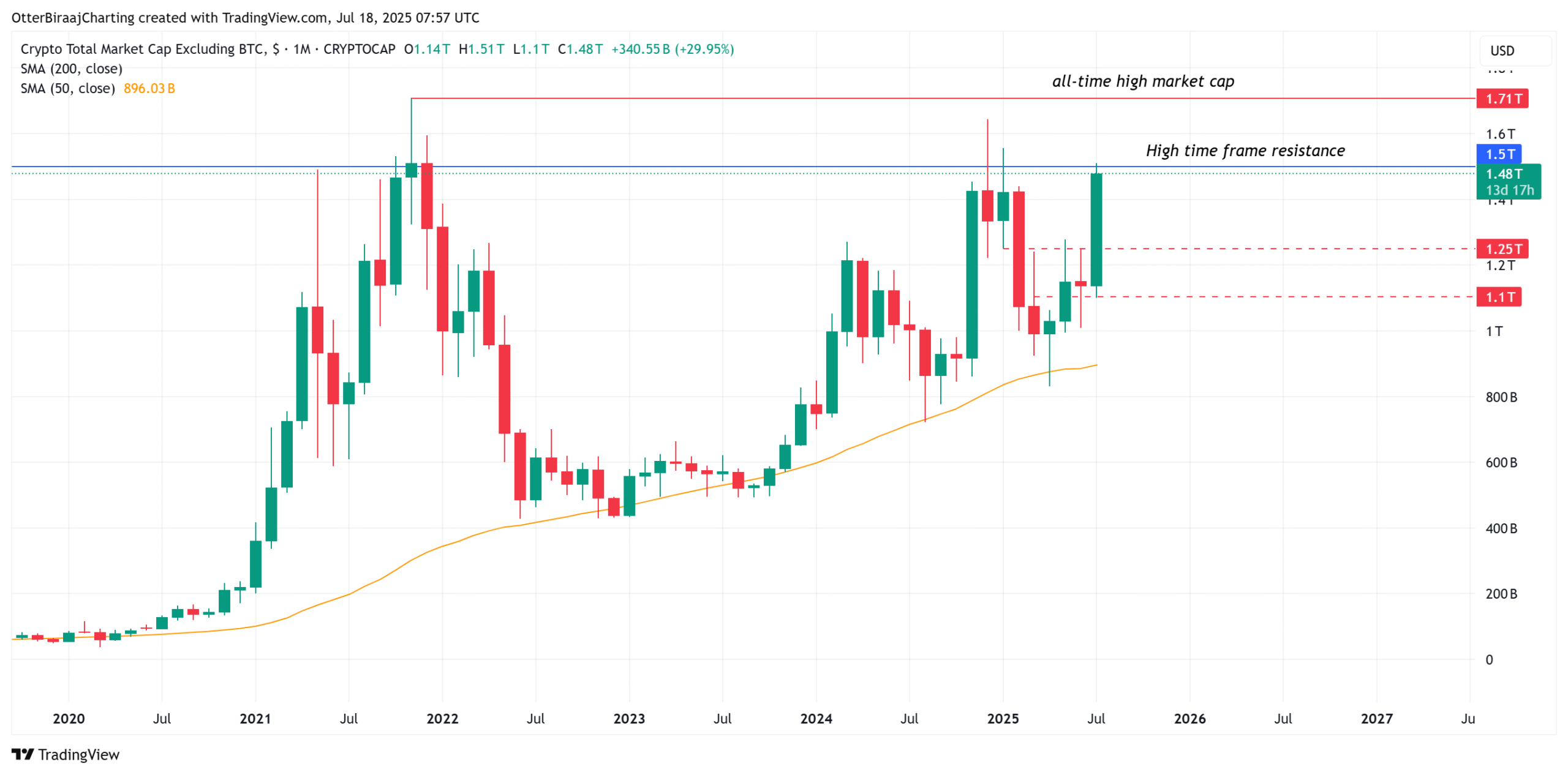 Capital rotation from Bitcoin (BTC) to altcoins continues with the TOTAL2 market cap (excluding BTC) tagging $1.5 trillion on Friday. This level is the higher time frame resistance, which was last tested in January 2025.