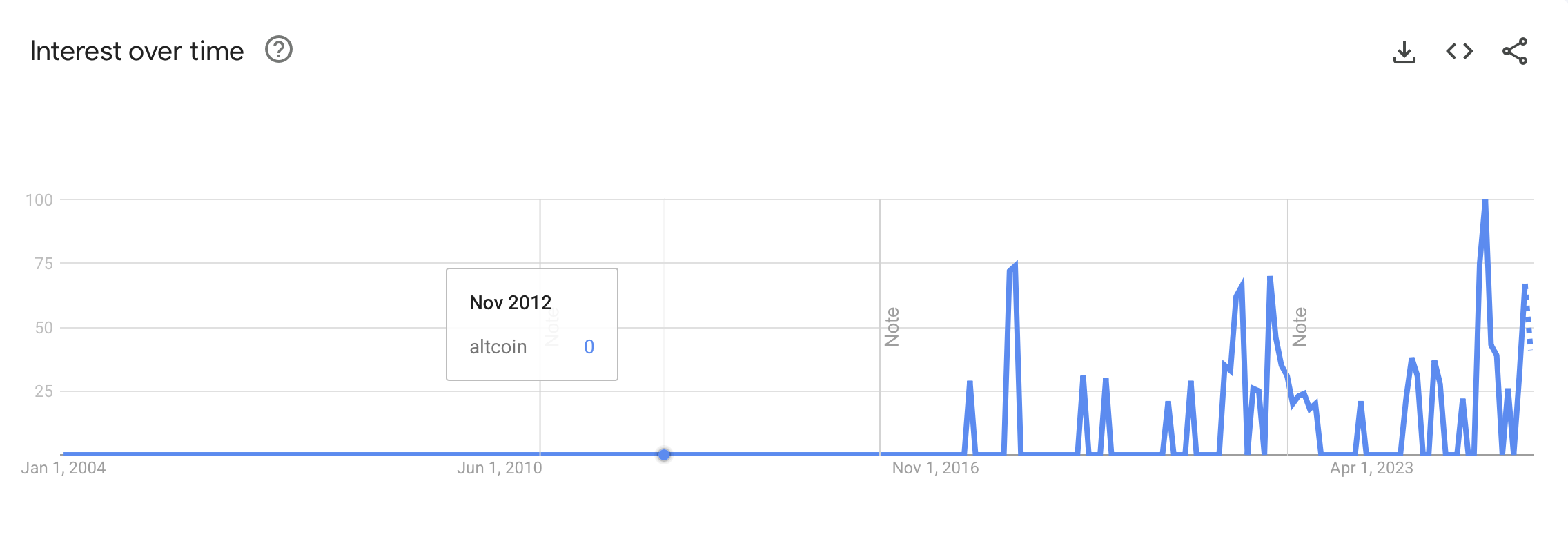 Google Trends has recorded similar surges before. In early 2018, “altcoins” spiked months after Bitcoin’s late-2017 peak, as retail attention turned toward a wave of new cryptocurrencies launched through initial coin offerings (ICOs).