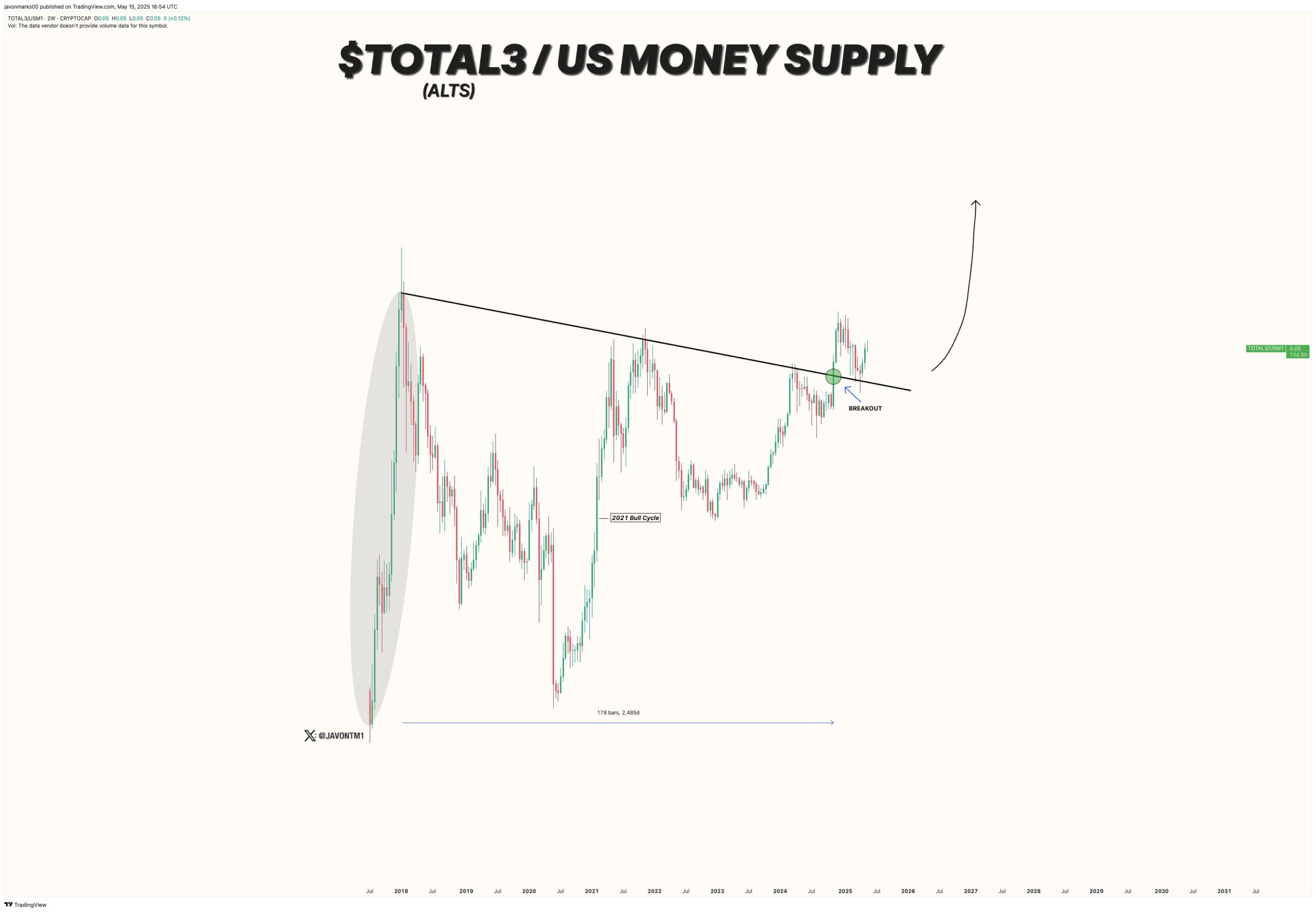 In a recent post on X, Marks highlighted a chart comparing the TOTAL3 index (total market cap of altcoins excluding Bitcoin (BTC) and Ethereum) against the US money supply, suggesting that altcoins may be on the verge of a significant rally.