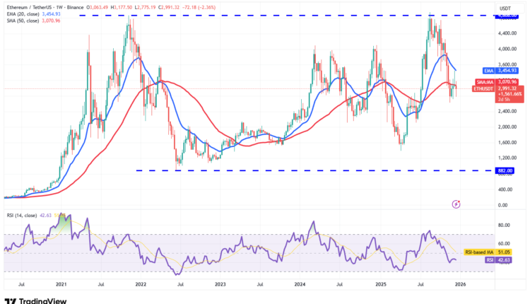 The Ether price has dipped below the 50-week simple moving average ($3,070), indicating that bears have the upper hand. Buyers attempted to start a recovery but are facing selling at the 20-week exponential moving average ($3,454).