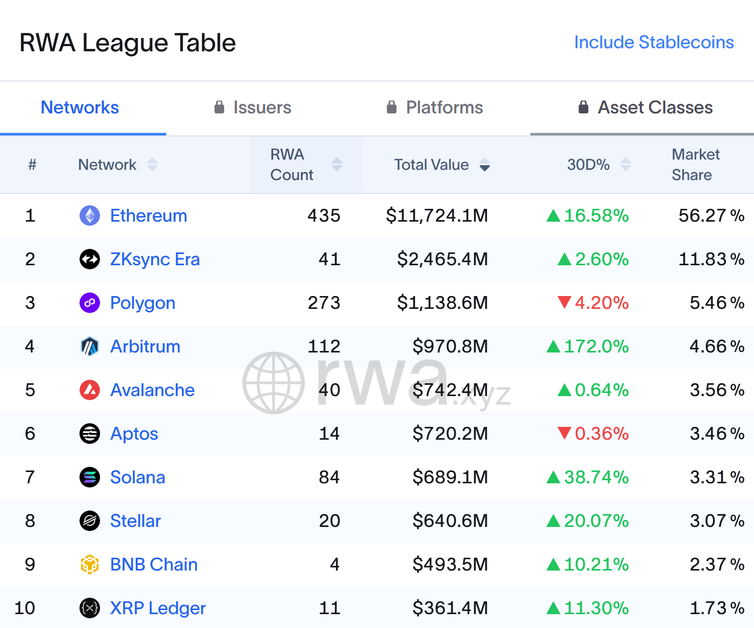 According to data from RWA.xyz, Polygon ranks third among all blockchains in real-world asset (RWA) tokenization, with over $1.13 billion in total value spread across 273 tokenized assets. Ethereum remains dominant with a 56% market share.