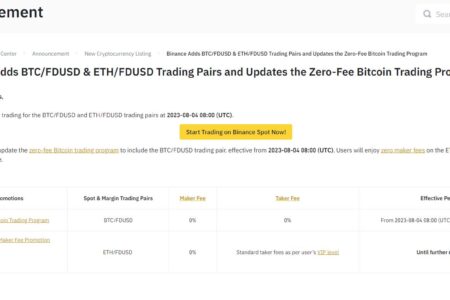 As per the announcement, starting from 08:00 UTC on August 4, users will benefit from zero maker and taker fees for BTC/FDUSD spot and margin trades through the Zero-Fee Bitcoin Trading Program. Additionally, users can trade ETH/FDUSD with zero maker fee, while the standard taker fee will apply based on the user’s VIP level.