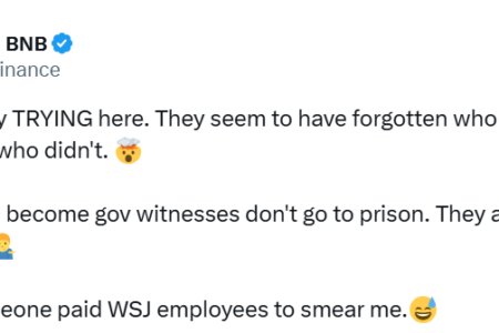“WSJ is really TRYING here. They seem to have forgotten who went to prison and who didn’t,” Zhao wrote in an April 12 X post. “People who become gov witnesses don’t go to prison. They are protected. I heard someone paid WSJ employees to smear me.”