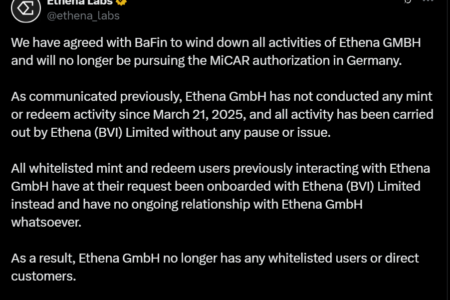Ethena Labs reached an agreement with Germany’s Federal Financial Supervisory Authority, also known as BaFin, to cease all operations of its local subsidiary, Ethena GmbH, according to an April 15 announcement.