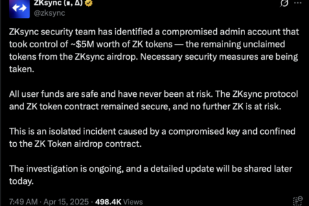 A hacker compromised a ZKsync admin account on April 15, minting $5 million worth of unclaimed airdrop tokens, according to a statement from the official ZKsync X account. The attack was described as isolated, with no user funds affected.