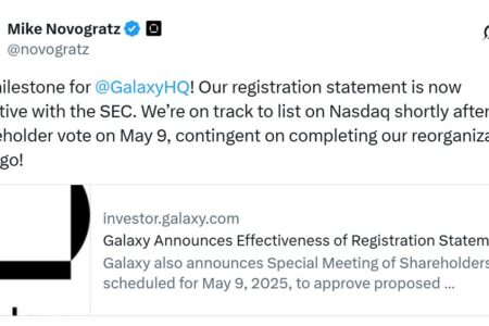 “Our registration statement is now effective with the SEC. We’re on track to list on the Nasdaq shortly after our shareholder vote on May 9, contingent on completing our reorganization. Let’s go!” Galaxy CEO Michael Novogratz said in an April 7 statement to X.