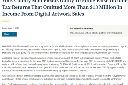 In 2021, Wilcox sold 62 CryptoPunk NFTs for a gain of about $7.4 million but reported significantly less on his taxes. In 2022, he sold 35 more CryptoPunks for $4.9 million. The Department of Justice said Wilcox intentionally selected “no” when asked if he had engaged in digital asset transactions on both filings.