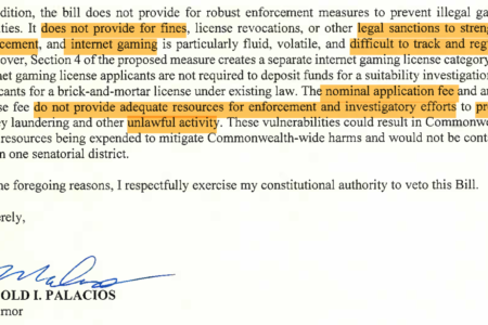 In vetoing the bill, Palacios didn’t comment on the proposed stablecoin, instead taking issue with its aim to police an industry that can cross jurisdictional boundaries, and said the measure lacked “robust enforcement measures to prevent illegal gaming activities.”