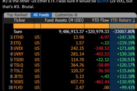Two ETFs designed to take two-times leveraged short positions in Ether claimed (ETH) first and second place in a Bloomberg Intelligence ranking of the year’s top-performing funds, Balchunas said in a post on the X platform.