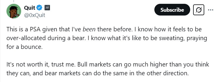 The executive said he’s in a “comfortable” position if things go south. Quit told followers to consider selling their stash if they’re uncomfortable with the asset going down.