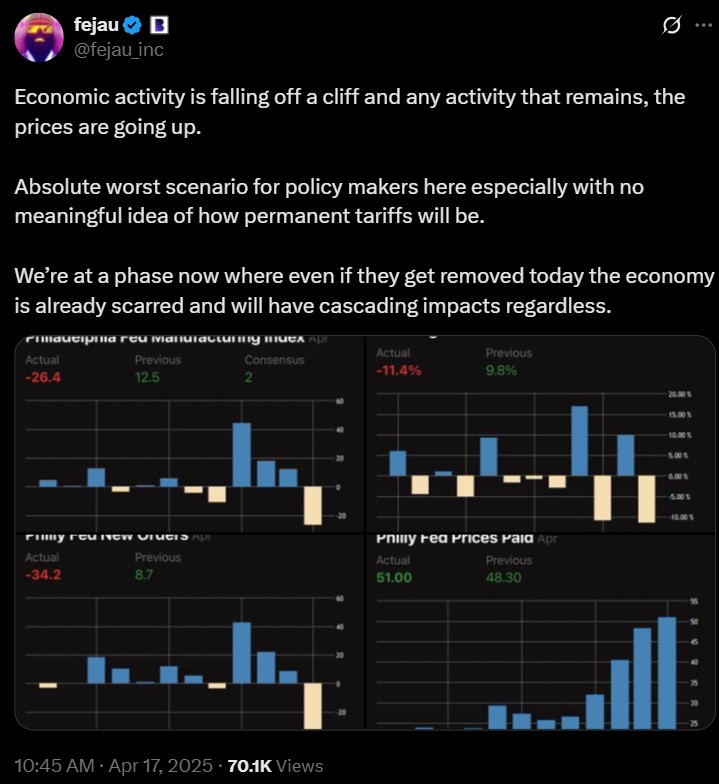 “Economic activity is falling off a cliff and any activity that remains, the prices are going up,” Felix Jauvin, a Blockworks macroeconomic analyst, said in a post on the X platform.