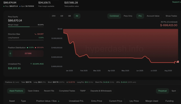 Tate “doesn’t seem to be good at perps trading,” as his cumulative losses are nearing $700,000 on this single Hyperliquid account, wrote blockchain analytics platform Lookonchain in a Friday X post. “So far, he’s made 80 trades on #Hyperliquid — only 29 were profitable (win rate: 36.25%) — with total losses of $699K.”