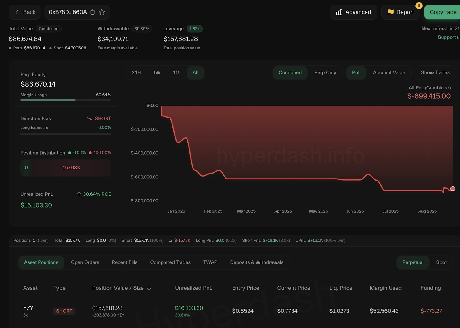 A wallet address linked to Tate has opened a 3x leveraged short position on the recently launched, West-linked YZY token at $0.85 and is currently sitting on a $16,000 loss on the position.