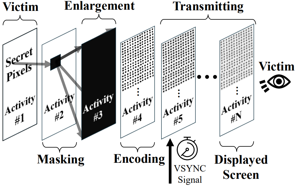 This is not as simple as the malicious application requesting and accessing the display content of another application. Instead, it layers a stack of attacker-controlled, semi-transparent activities to mask all but a chosen pixel, then manipulates that pixel so its color dominates the frame.