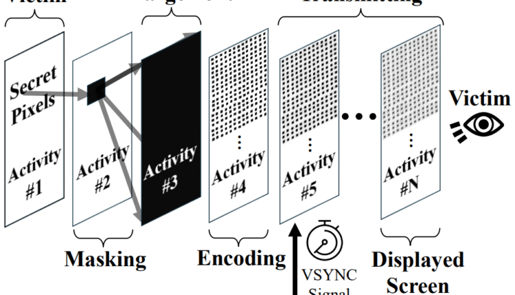 This is not as simple as the malicious application requesting and accessing the display content of another application. Instead, it layers a stack of attacker-controlled, semi-transparent activities to mask all but a chosen pixel, then manipulates that pixel so its color dominates the frame.