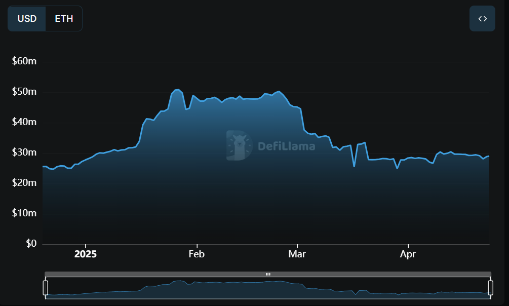 The Theo network secures nearly $29 million in total value locked as of April 23, according to industry data.