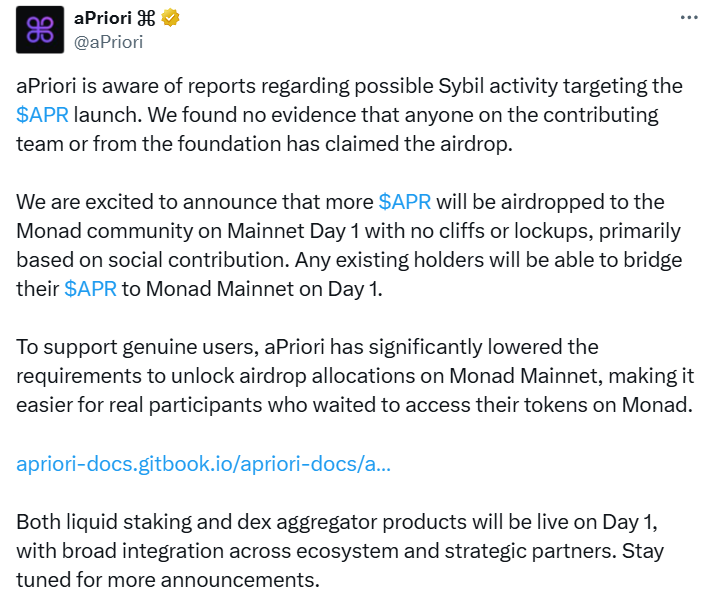 APriori increases Monad airdrop allocation, crypto investors remain divided