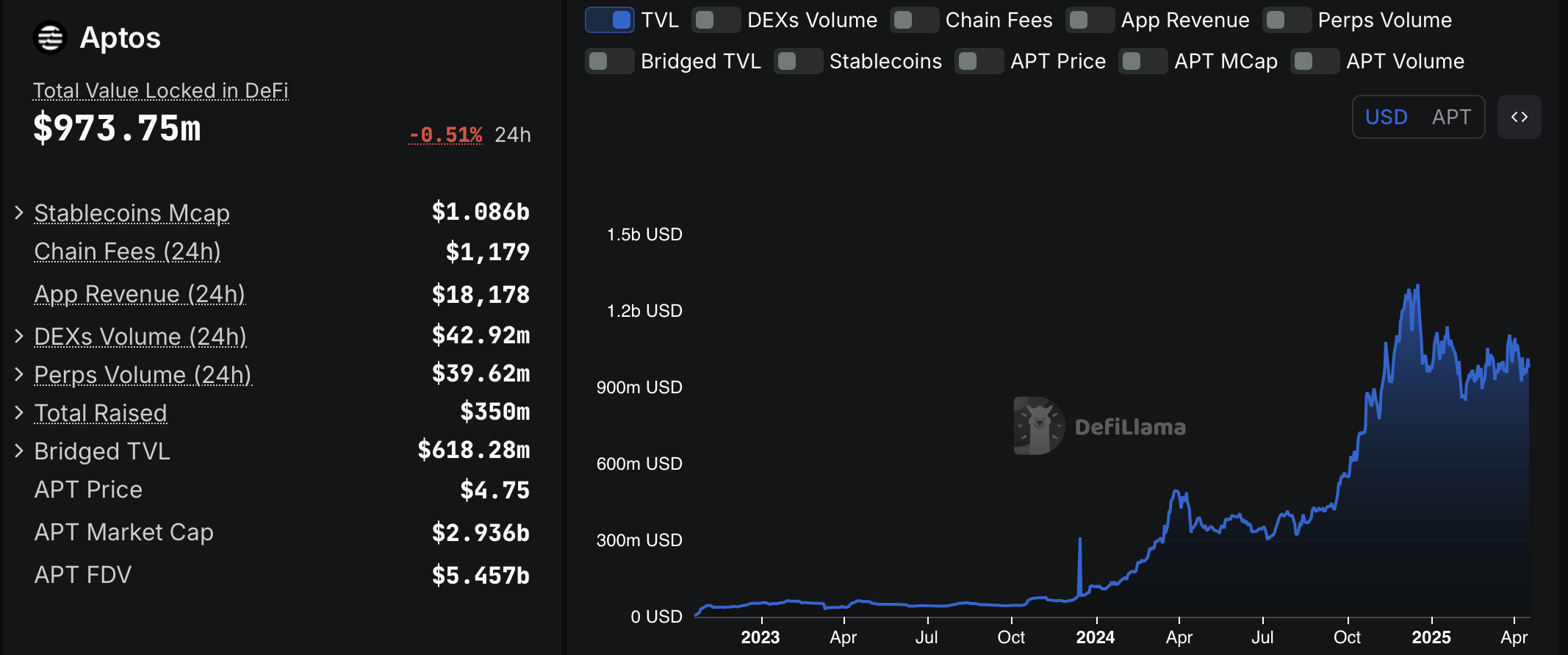 Aptos was founded in 2021 by a group of former Meta engineers. According to DefiLlama, the Aptos blockchain has a total value locked of $974 million as of April 18, with nearly a $320 million coming from lending protocol Aries Markets.